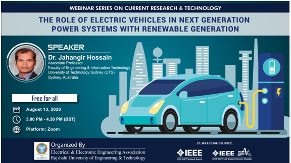 It is our great pleasure to inform you that EEE Association, RUET in association with IEEE RUET IAS Student Branch Chapter and IEEE RUET Student Branch is going to organize a webinar titled "The Role of Electric Vehicles in Next Generation Power Systems with Renewable Generation" as a part of the "Webinar Series on Current Research and Technology" on August 13, 2020 at 3.00 PM to 4.30 PM  at Online Platform: Zoom.