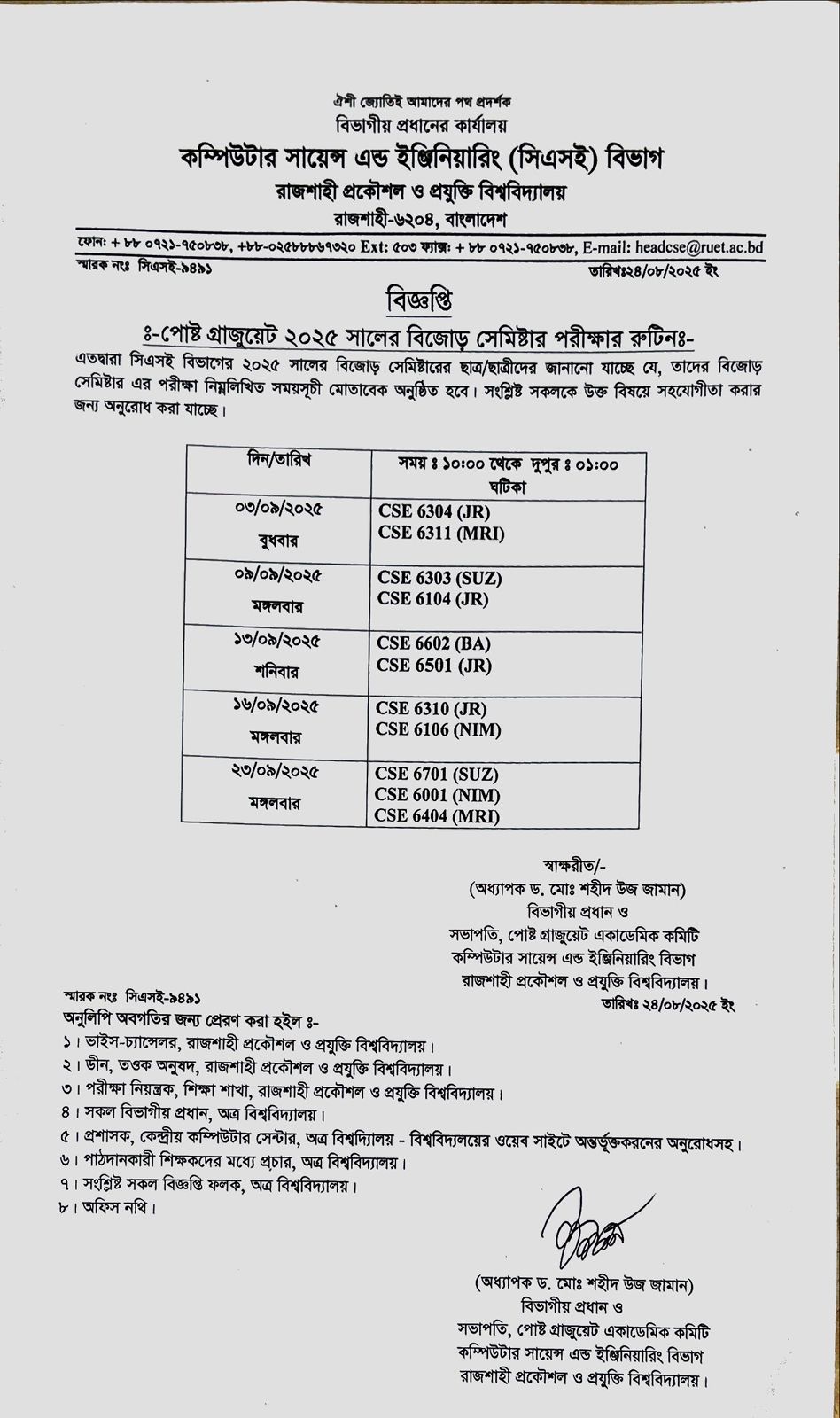 Examination Schedule of the B.Sc. 2nd Year Odd Semester (2023 Series), 2025, Department of EEE, CSE, ETE & ECE.